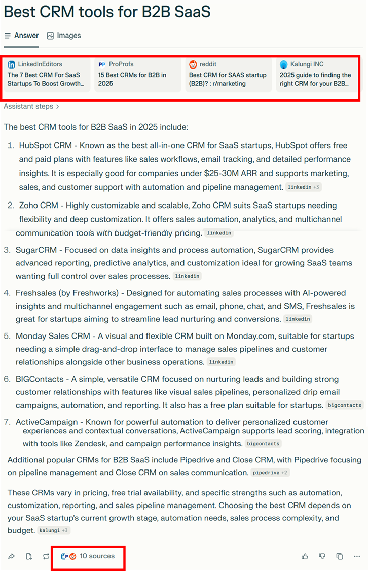 Wenn beispielsweise ein Interessent in Perplexity fragt: „Beste CRM-Tools für B2B SaaS“, kann die Plattform Ihre Marke auflisten oder zitieren – aber dieses Erscheinen wird nicht als Klick oder Besuch registriert.